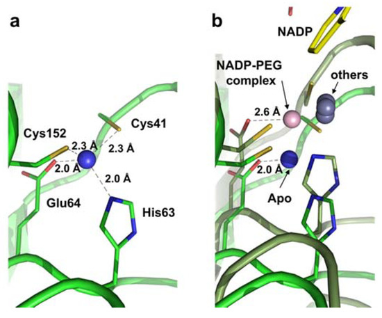 We observed a cleft between the SBD (substrate-binding domain) and NBD (nucleotide-binding domain) that forms the active site with a catalytic Zn2+ ion (Figure 2a). It was found that the catalytic Zn2+ ion is coordinated by the tetrahedral combination of Cys41, His63, Glu64, and Cys152, which were well conserved (Figure 1). In the apo structure, distances ranging from 2.0 to 2.3 Å were shown between the zinc ion and its coordinated resides; Cys41 (2.3 Å), His63 (2.0 Å), Glu64 (2.0 Å), and Cys152 (2.3 Å) (Figure 3a). Meanwhile, each position of the four residues was 0.6 Å farther away from catalytic zinc in the EcYjgB-NADP complex, based on its superimposed structure with the apo form through the NBD region (Figure 3b). Although the catalytic components were relatively relocated toward the nicotinamide ring of NADP, their positions were still not properly matched to those of other CAD/SAD structures.