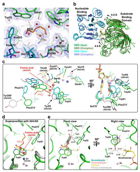 We tried to obtain the crystal structure with the substrate or NADP to investigate the reaction mechanism of EcYjgB for broad substrates. During the determination of the structure comprising NADP, we found that a polyethylene glycol (PEG) fragment occupied its catalytic cavity, which was quite similar to a hexanaldehyde (Figure 4a). As it is holding the NADP, the SBD moves about 4.0 Å toward the NBD with a root-mean-square deviation (r.m.s.d.) of 1.02 Å when compared to the apo structure (Figure 4b). It represents that NADP binding can generate the closed form, as observed in other CAD/SAD family. The superposition of the EcYjgB-NADP complex structure with a closed form of SbCAD implied that NADP binding is likely to induce the conformational change upon substrate-binding to hold a substrate or a PEG fragment (Figure 4c). Thus, several conserved catalytic residues were relocated to the vicinity of their counterpart in SbCAD, such as Ser42, Trp52, Trp91, and Tyr95. The tryptophan residues may play a crucial role in holding PEG due to their aromatic rings. The catalytic zinc of NADP complex was not completely moved to the proper position, although PEG was occupied at the substrate-binding pocket, as mentioned previously. This might indicate that the absence of aldehyde group in PEG led positions of Cys41, Ser42, and Glu64 adjacent to those of counterparts in SbCAD. Interestingly, Phe273′ of dimeric chain was located unalike to the closed form of SbCAD (Figure 4c). In contrast, Tyr288′ faced outside of the substrate-binding pocket without an aromatic ring or its equivalent to that in the formic acid. Phe273′ turns toward the substrate binding site since PEG occupies the substrate-binding pocket after the conformational change upon NADP binding. Consequently, the oxygen from PEG nearby Phe273′ could form a kind of anion–π interaction that contributes to holding the ligand.