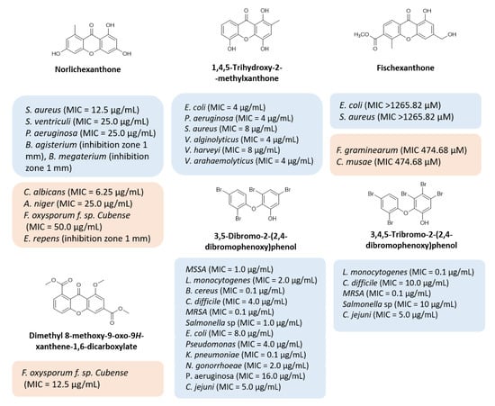 - Loureiro, D.R.P.; Soares, J.X.; Costa, J.C.; Magalhães, Á.F.; Azevedo, C.M.G.; Pinto, M.M.M.; Afonso, C.M.M. Structures, Activities and Drug-Likeness of Anti-Infective Xanthone Derivatives Isolated from the Marine Environment: A Review. Molecules 2019, 24, 243. [Google Scholar] [CrossRef]