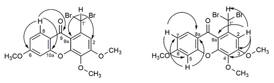 As an example, the main correlations between protons and carbons for 1-(dibromomethyl)-3,4,6-trimethoxy-9H-xanthen-9-one 8 are represented in Figure 2. The highly deshielded H-1′ (δH-1′ 8.98 ppm) can be identified through the correlation with C-2 and C-9a. Between the aromatic protons, H-8 (δH-8 8.20 ppm) appears in the form of a doublet and presents a correlation with C-6, C-9, and C-10a. On the other hand, the signals corresponding to the resonance of protons H-2 (δH-2 7.74 ppm) and H-5 (δH-5 6.97–6.92 ppm) are easily distinguished through the correlations presented: while H-2 correlates with C-1′, C-3, C-4 and C-9a, H-5 presents correlations with C-6, C-7, C-8a, and C-10a.
