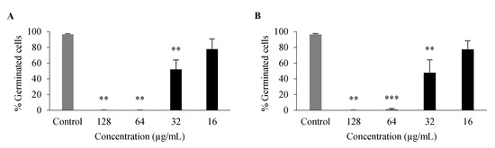 For compounds with some antifungal activity (Table 4), their effect on processes associated with C. albicans virulence was assessed, namely on germ tube and biofilm formation. Only 3 and 26 had an inhibitory effect on germ tube formation of C. albicans ATCC 10,231 (Figure 4), with no germination at 128 μg/mL and 64 μg/mL and a significant inhibition at 32 μg/mL, even though these compounds had no effect on overall growth at these concentrations.