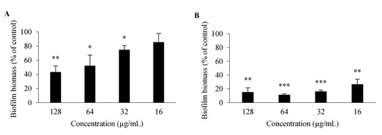 Percentage of C. albicans ATCC 10,231 biofilm formation after 48-h incubation with 3 (A), 26 (B). Data are shown as mean ± SD of three independent assays. One-sample t-test: * p < 0.05, ** p < 0.01, *** p < 0.001 significantly different from 100%.