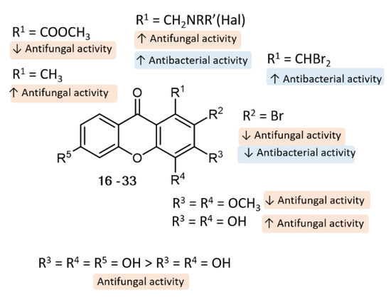Putative SAR for the antibacterial and antifungal activity of xanthone analogues.