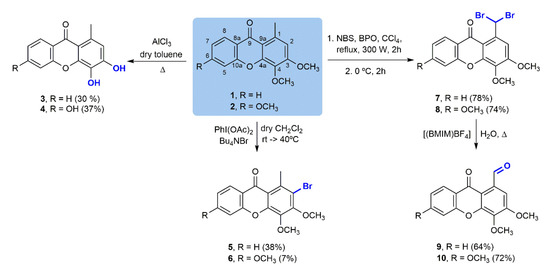 In order to synthetize a collection of structurally diverse compounds, several straightforward transformations were performed for two simple oxygenated xanthones: 3,4-dimethoxy-1-methyl-9H-xanthen-9-one (1) and 3,4,6-trimethoxy-1-methyl-9H-xanthen-9-one (2) (Scheme 1), obtained as previously described [19,20]. The corresponding phenols, 3 and 4, were prepared using AlCl3 as the O-demethylating agent. Selective C-2 bromination of 1 and 2 with a Bu4NBr/PhI(OAc)2 system under mild conditions produced 2-bromo-3,4-dimethoxy-1-methyl-9H-xanthen-9-one (5) and 2-bromo-3,4,6-trimethoxy-1-methyl-9H-xanthen-9-one (6) [21]. The low yields obtained in this reaction are due to failure of the reaction to go to completion and other complications in the purification step. On the other hand, Wohl–Ziegler bromination of 1 and 2 using N-bromosuccinimide (NBS) brominating agent and benzoyl peroxide (BPO) as the radical initiator afforded 1-(dibromomethyl)-3,4-dimethoxy-9H-xanthen-9-one (7) [22] and 1-(dibromomethyl)-3,4,6-trimethoxy-9H-xanthen-9-one (8), respectively. Subsequent solvolytic displacement of bromine atoms of the gem-dibromomethylated derivatives 7 and 8 was successfully accomplished using 1-butyl-3-methylimidazolium tetrafluoroborate ((bmIm)BF4) and water, under conventional heating, and furnished carbaldehydic xanthones 9 [22] and 10 in good yields.