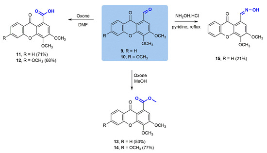 To further extend the diversity of the compound library, and due to the high versatility of the formyl group in organic chemistry, additional transformations were performed in carbaldehydic xanthones 9 and 10 (Scheme 2). Oxidation employing Oxone® as the sole oxidant [23] to the corresponding carboxylic acids 11 and 12 and to ester products 13 and 14 was effectively accomplished in good yields either for the acids (71% and 68%, respectively) or the corresponding esters (53% and 77%, respectively). Furthermore, a condensation of xanthone 9 with hydroxylamine made it possible to obtain aldoxime 15 with a moderate yield (21%), justified by laborious purification and consequent product losses.