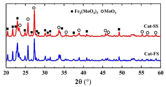 The catalysts were prepared by the coprecipitation method with different stirring speeds. The speed for Cat-SS was 30 r·min−1, and for Cat-FS was 600 r·min−1. AHM and iron nitrate were dissolved in deionized water at concentrations of 0.29 mol·L−1 and 0.94 mol·L−1, respectively, and a Mo/Fe mole ratio of 2.60. The ferric nitrate solution was added dropwise to the AHM solution over 30 min at 60 °C. The pH value was tested by phs-3C pH meter, and maintained at pH = 2.0 by adding ammonia. The precipitate was collected by suction filtration, washed, dried in an oven at 60 °C for 12 h, and then calcined in a muffle furnace at 500 °C for 24 h.