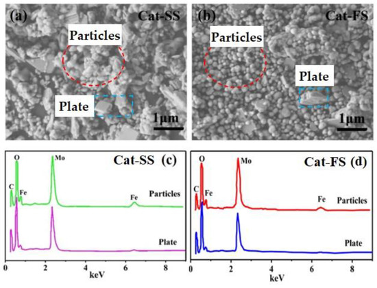 Figure 2a,b show SEM images of the two catalysts. It can be clearly seen that the catalysts comprised particle-and plate-like structures. Cat-SS has more plate-like structures and showed an obvious agglomeration of particles. However, Cat-FS has few plate-like structures and the particles were dispersed uniformly.