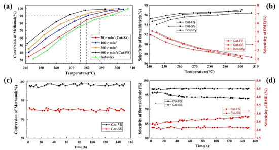 The stability of the catalysts was also tested at 300 °C for 150 h, as shown in Figure 4c,d. With Cat-FS, the methanol conversion and formaldehyde selectivity remained unchanged for 150 h. However, although methanol conversion of Cat-SS was unchanged, the selectivity of the formaldehyde decreased from 96.7% to 96.2%, and that of DME increased from 2.3% to 2.8%. These results illustrated that Cat-SS had not only poor activity and selectivity, but also poor stability.