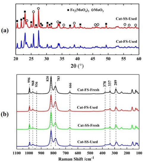 Figure 5a shows the XRD patterns of catalysts after stability testing; the XRD patterns are almost identical with those of fresh catalysts. All the diffraction peaks were assigned to Fe2(MoO4)3 and MoO3, implying that the structure of two catalysts had not changed. Figure 5a illustrates the Raman spectra of fresh and used catalysts, where the lines at 968, 936, 783, 352 and 337 cm−1 belong to Fe2(MoO4)3, and those a of 996, 820, 669, 337 and 289 cm−1 to MoO3. The used catalyst was similar to the fresh catalyst, implying that no new phase composition was generated after stability testing. Moreover, the Mo/Fe mole ratio of the used catalysts was not significantly lower than that of the fresh catalysts analyzed by ICP and XPS, as shown in Table 1. These results exclude the effect of changes in the Mo/Fe mole ratio and the structure of catalysts on the DEM selectivity of Cat-SS in the stability testing.