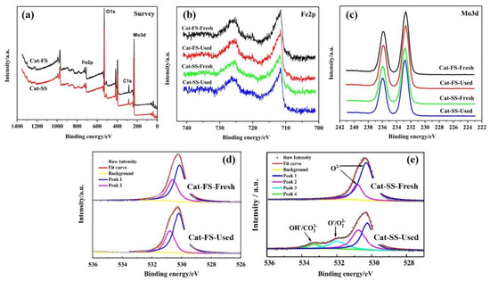XPS profiles of fresh and used catalysts: (a) Survey, (b) Fe2p, (c) Mo3d, (d) O1s of Cat-FS and (e) O1s of Cat-SS.