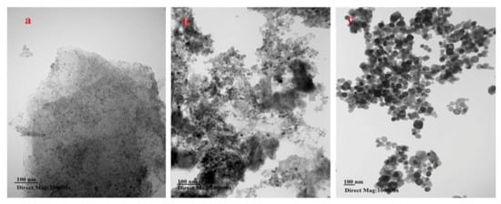 Reduced graphene oxide (RGO) is a nanomaterial obtained by chemical reduction of graphene oxide. RGO contains fewer oxygen groups than GO and reduction leads to an increase in the porosity as a result of exfoliation and rearrangement of layers [54]. RGO can be easily synthesized by dispersing GO in water and using hydrazine hydrate as a reductant. The reduction is normally carried out under stirring and heating. Magnetic RGO can be also prepared by approaches similar to those for the preparation of GO/Fe3O4, such as chemical co-precipitation, solvothermal, or hydrothermal approaches. In this way, the benefits of RGO and magnetic nanoparticles are combined to prepare highly efficient sorbents. Other reduction methods including electrochemical reduction, thermal reduction, microwave and photo reduction, photo-catalyst reduction, and reduction with green chemicals (e.g., ascorbic acid) can also be implemented for the preparation of RGO from GO [55,56,57]. Figure 1 shows the transmission electron microscopy (TEM) images of magnetic RGO prepared by the solvothermal (a), hydrothermal (b), and co-precipitation approaches (c).