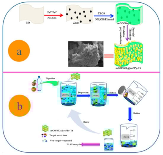 In 2017, Molaei et al. synthesized a SiO2-coated magnetic GO modified with polypyrrole–polythiophene. For this purpose, magnetic GO was coated with SiO2 and the composite was modified by a copolymer with an in situ simultaneous oxidative polymerization of pyrrole and thiophene monomers, using iron chloride as an oxidant and dopant. The presence of N- and S-containing moieties enhanced the extraction efficiency of the nanocomposite and the selectivity of the MSPE procedure. The novel sorbent was successfully employed for the extraction of trace amounts of heavy metals (copper, lead, chromium, zinc, and cadmium) from water and agricultural samples prior to FAAS determination [87]. Figure 2 shows the synthesis (a) and application (b) of the PPy-PTh-functionalized magnetic GO.