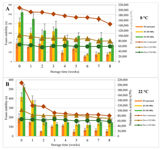 Impact of high-pressure treatment at 250 MPa for 5 min or 550 MPa for 5 min on the foam stability (FS, in columns) and the activity of proteinase A (pro-A, inline connections) compared with the untreated sample during 8 weeks of storage at (A) 8 °C or (B) 22 °C.