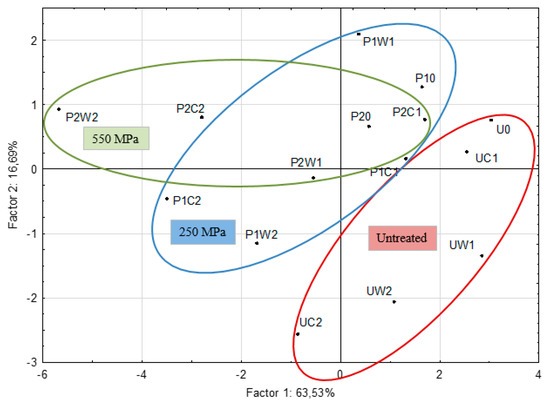 Principal component analysis according to the content of staling aldehydes in beers processed at different pressures (250 MPa or 550 MPa) and stored in cold (8 °C) or at room temperature (22 °C) for 1 or 2 months. Control sample was beer untreated by pressure processing. Particular samples are coded according to the type of treatment as listed in Table 2. Samples are clustered in 3 groups according to the type of processing (untreated, processed at 250 MPa or at 550 MPa).