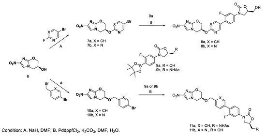 The syntheses of the conjugate molecules formed by the oxazine fused nitroimidazole and the oxazolidinone core 8a–b and 11a–b are summarized in Scheme 1. The known (S)-2-nitro-6,7-dihydro-5H-imidazo[2,1-b][1,3]oxazin-6-ol core (6) was prepared according to literature procedures [8]. Intermediates 7a–b and 10a–b were prepared by aromatic or nucleophilic substitution reaction. Suzuki coupling with the oxazolidinone piece 9a or 9b provided conjugate molecules 8a–b and 11a–b.