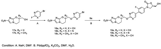 Scheme 3 summarizes the syntheses of a third series of conjugate molecules 19a–c. This series contains the same oxazine fused nitroimidazole core as shown in Scheme 1, but connects to the oxazolidinones via a different linking point. The known racemate intermediates (2-nitro-6,7-dihydro-5H-imidazo[2,1-b][1,3]oxazin-7-yl)methanol (17a) and (7-methyl-2-nitro-6,7-dihydro-5H-imidazo[2,1-b][1,3]oxazin-7-yl)methanol (17b) were prepared according to a procedure described in the literature [10]. Aromatic substitution provided intermediates 18a–c. Suzuki coupling with the oxazolidinone precursor 9a provided diastereomeric conjugate molecules 19a–c.
