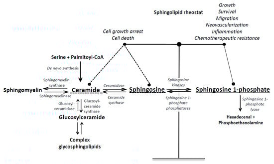 Decreased catabolism of S1P has been observed in different cancer types where the loss of S1P lyase activity was shown to promote chemoresistance and to drive neoplastic transformation and tumorigenesis [111]. For example, the study in patients with prostate cancer demonstrated that S1P lyase expression and activity was significantly down regulated in tumor tissues in comparison with normal adjacent tissues and was correlated with the aggressiveness of prostate cancer [111]. Reduced degradation of S1P in prostate cancer was paralleled by increased enzymatic activity of SphK1 in cancer tissues, which suggests that S1P metabolism in prostate cancer is shifted towards the S1P production. Silencing of S1P lyase activity in prostate cancer cells gave rise to their improved survival after irradiation and chemotherapy drug docetaxel, whereas its overexpression increased the sensitivity of prostate cancer cells to irradiation and chemotherapy as a result of altered ceramide/S1P balance in favor of ceramide production [111]. This and similar studies [112] suggest that up-regulation of S1P lyase activity could represent an efficient strategy to counteract chemoresistance.