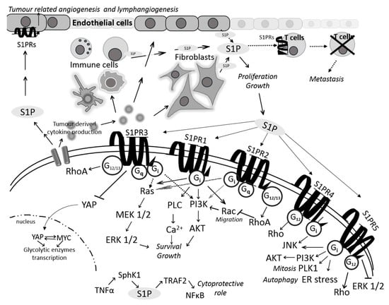 S1P-mediated interactions between cancer cells and the components of tumor microenvironment (TME). Tumor cells enable cytokine production that, when released in TME, stimulate endothelial cells, fibroblasts or immune cells to produce and secrete S1P. In this way, cancer cell ensures its survival and proliferation. On the other hand, S1P secreted from cancer cells can influence endothelial cells to promote angiogenesis and lymphangiogenesis but also suppress the activity of cytotoxic T-cells. Secreted S1P also binds to five different plasma membrane G protein-coupled receptors (S1PR1–5). Activated receptors, through the interaction with various associated G proteins, can regulate survival, proliferation, angiogenesis and migration by inducing several oncogenic signaling pathways such as RAS/MEK/ERK and PI3K/AKT. In comparison with S1P receptors 1, 3, 4 and 5, S1PR2 is known to bear dual role via either inhibition or activation of RAS/ERK and PI3K/AKT signaling due to its ability to couple to different G proteins.