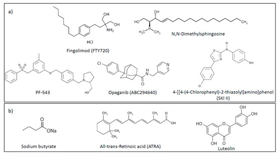 Chemical structures of compounds targeting S1P metabolism and signaling. (a) synthetic compounds; (b) natural compounds.