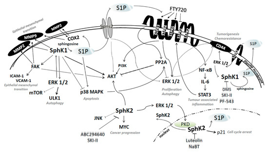 Sphingosine 1-phosphate (S1P), a bioactive lipid mediator, is found in various cancerous tissues as well as in tumor microenvironment (TME). S1P governs the processes that drive cancer cell growth and progression including proliferation, survival, migration, invasion, angiogenesis, lymphangiogenesis and inflammation [1]. The dynamic balance between pro-survival S1P and pro-apoptotic sphingolipid species including ceramide and sphingosine, the so-called sphingolipid rheostat, is deemed critical for determining cell fate (Figure 1). Thus, the agents that shift the balance between ceramide-sphingosine-S1P can steer the cells towards either apoptosis or survival depending on the relative position of the rheostat [2]. The intracellular concentration of S1P is low and tightly controlled by the balance between its production catalyzed by sphingosine kinases, dephosphorylation back to sphingosine by S1P phosphatases and lipid phosphate phosphatases (LPPs), and its catabolism catalyzed by endoplasmic reticulum enzyme S1P lyase. There are two isotypes of sphingosine kinases that differ in their tissue distribution, subcellular localization and conformation and dimerization properties. Sphingosine kinase 1 (SphK1) is mainly localized in the cytosol and generates S1P that is transported outside the cell to the extracellular space including the tumor microenvironment [3]. Oppositely, sphingosine kinase 2 (SphK2) is found predominantly in the nucleus, mitochondrion and endoplasmic reticulum and produces S1P that binds primarily to intracellular targets [4]. Both enzymes can be exported from the cells. Thus, SphK1 can be secreted by endothelial cells [5], whereas SphK2 is cleaved by caspase-1 in the cells undergoing apoptosis and its truncated, enzymatically active fragment released into the extracellular space [6]. Extracellular sphingosine kinases as well as secretion of S1P from the cells via autocrine or paracrine signaling contribute to the availability of circulating S1P. S1P in the circulation is bound to albumin, low-density lipoproteins and high-density lipoproteins, and can be also carried by erythrocytes. Extracellular S1P is dephosphorylated into sphingosine mainly by the ecto-activities of LPPs which facilitate cellular entry of sphingosine produced from S1P outside the cells [7]. Once inside the cells, sphingosine is phosphorylated back to S1P which triggers intracellular signaling events.