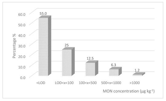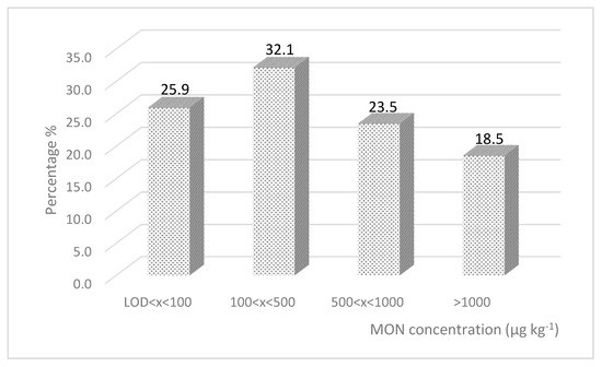 The MON contamination was very widespread and remarkable; the toxin was detected in almost all the samples (95.1%) and exceeded 500 and 1000 µg kg−1 in 42.0% and in 18.5% of samples, respectively. Figure 2 shows the MON relative frequency distribution in maize samples.