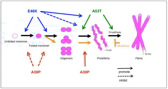 - Conway, K.A.; Lee, S.J.; Rochet, J.-C.; Ding, T.T.; Williamson, R.E.; Lansbury, P.T. Acceleration of oligomerization, not fibrillization, is a shared property of both α-synuclein mutations linked to early-onset Parkinson’s disease: Implications for pathogenesis and therapy. Proc. Natl. Acad. Sci. USA 2000, 97, 571–576. [Google Scholar] [CrossRef] [PubMed]