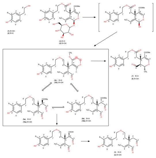 Proposed mechanism of oleocanthal (5) and oleacein (6) formation, starting from ligstroside (3) or oleuropein (4) through oleokoronal (9) or oleomissional (10). Hydroxytyrosol (1), tyrosol (2), ligstroside aglycon monoaldehydic form (7), and oleuropein aglycon monoaldehydic form (8) are also represented.