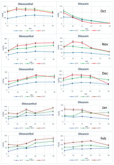 The most interesting results were obtained from the investigation of the individual phenols during malaxation. In all ripening degrees of cv Koroneiki, we noticed that when we applied low temperature, the concentration of oleocanthal was increasing at least until 45 min of malaxation. In one case, the increase lasted until the 60th min. Concerning the concentration of oleacein we noticed that the increase of its concentration lasted until the 30th min of malaxation. In some cases, the increase stopped at 45 min. When higher temperature was applied, we noticed statistically significant higher levels of oleocanthal and oleacein concentration as we mentioned before (Tables S12 and S13). Additionally, we noticed that the concentration of oleocanthal had an increasing trend in the higher temperatures. Respectively, oleacein showed an increasing trend during malaxation which lasted until the 30th min in 4 out of 5 harvest time points (Figure 3). Especially for oleacein which is an orthodiphenolic compound and is more susceptible to enzymatic and chemical oxidation, it should be noted that as discussed in 2.5, oleacein is produced from oleomissional during malaxation (through demethylation and decarboxylation) and this can overcome the loss due to chemical and enzymatic oxidation.