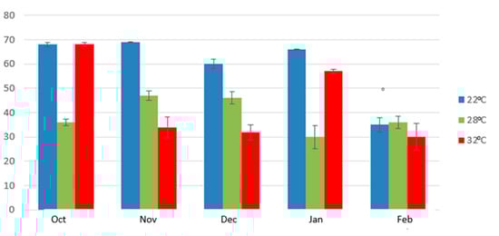 The impact of malaxation temperature was mainly studied in cv Koroneiki. In these experiments we observed that the malaxation temperature had also a significant effect on the total phenolic content. In most of the experiments, when malaxation temperature increased from 22 °C to 28 °C or 32 °C the total phenolic content also increased its maximum concentration. The increase of the total phenolic content, depending on the malaxation duration, reached up to 40% (300 mg/kg to 500 mg/kg) at the latest ripening stage (Figure 1).