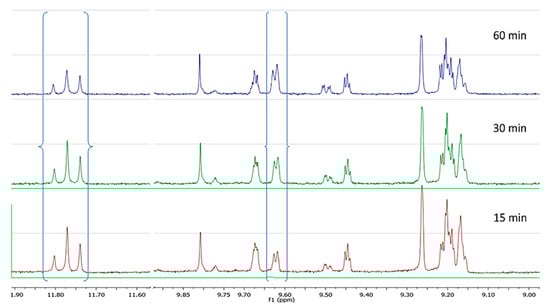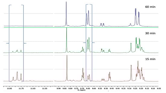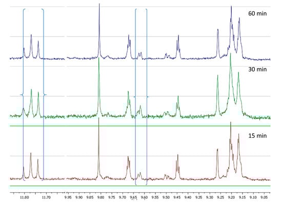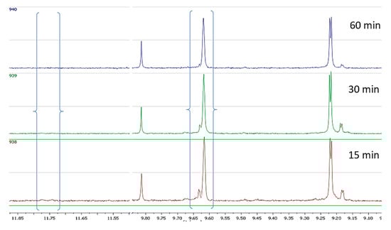 NMR profile of cv Koroneiki at 28 °C, at three malaxation times, showing the characteristic peaks of the analyzed phenolic compounds.