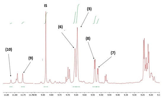 Example of NMR spectrum (400 MHz) of the aldehydic region of a typical olive oil extract depicting the selected peaks that were used for integration: oleocanthal (5), oleacein (6), ligstroside aglycon monoaldehydic form (7), oleuropein aglycon monoaldehydic form (8) oleokoronal (9), oleomissional (10). IS: internal standard (syringaldehyde).