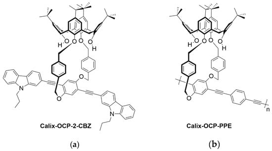Chemical structures of Calix-OCP-2-CBZ (a) [] and Calix-OCP-PPE (b) [].
