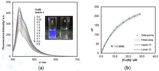 Polymer 4 is the de-tert-butylated analogue of 5. Owing to the absence of tert-butyl groups in the calixarene upper rim, the conformational mobility of the calixarene moiety is much higher. This structural lability may have an impact on the binding affinity to metal ions. It is, thus, of interest to compare the behaviour of polymer 4 with polymer 5 in terms of its sensitivity and selectivity. The spectra of 4 upon successive additions of Cu(II) is shown in Figure 6a. After the addition of 5 equivalents of copper ion, the initial emission only drops by 14%. This represents a huge loss of affinity for Cu(II). The curve-fitting plots are depicted in Figure 6b. A Ka = (5.29 ± 0.78) × 103 M−1 was obtained from the regression analysis, which is 16 times lower than that of polymer 5.