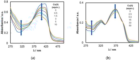 Absorption spectra of (a) polymer 5 (8.2 × 10−5 M in CH3CN:CHCl3, 1:1) and (b) Calix-OCP-2-CBZ (5.0 × 10−6 M in CH3CN) upon addition of increasing amounts of Cu(ClO4)2.