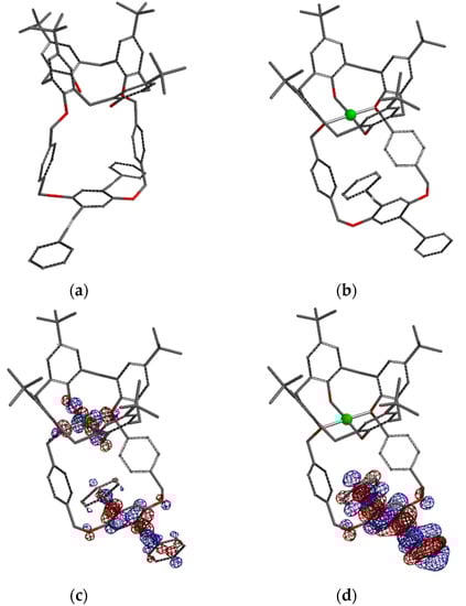 The energy and geometry of the complex were optimised by DFT calculations at B3LYP/6-31G(d) level of theory [] (see details in Materials and Methods section). On complexation with Cu(II) ion, the structure of the host, having in its unbound state a pinched cone conformation (C2v symmetry) in the calixarene unit (Figure 5a), adopts an almost perfect cone arrangement (C4v symmetry) (Figure 5b). Besides, the attached oxacyclophane ring changes its pristine conformation dramatically in order to better accommodate the copper ion.