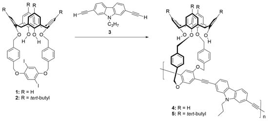 Cross-coupling of calix[4]arene diiodo derivatives 1 and 2 with 2,7-diethynyl-9-propyl-9H-carbazole (3) using PdCl2(PPh3)2/CuI catalytic system in toluene/NEt3 at 35 °C for 24–48 h.