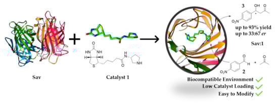 Streptavidin (Sav) is an ideal host for chemical catalysis [,,,,,,]. As the valeric acid motif of biotin is largely not involved in binding, it can be covalently added with an organocatalyst and introduced to Sav. Consequently, streptavidin can be used to host chemical catalysis [,,,], and applications ranging from dynamic kinetic resolution and biomolecular labeling to molecular switch design can be established [,,,,,]. Importantly, it has been demonstrated that nucleophiles can be generated via organocatalysis within Sav []. Indeed, biotin can be modified with pyrrolidine and introduced into Sav, creating a protein-based secondary amine organocatalytic system []. While this catalytic motif (catalyst 1) contains essentially no bulky or H-bonding substituents adjacent to the reacting nitrogen atom, this Sav-based system was able to mediate carbon–carbon bond formation (i.e., 1,4-Michael addition) in good yield and stereoselectivity []. Bringing these findings together, Sav is seemingly an ideal host for organocatalytic aldol addition reactions.