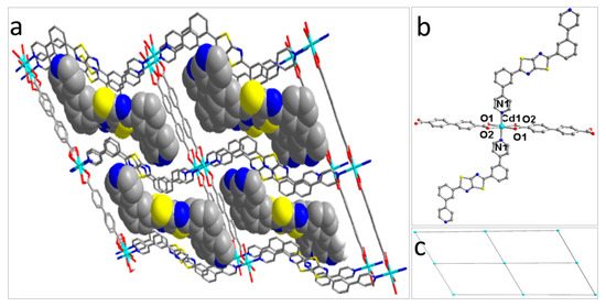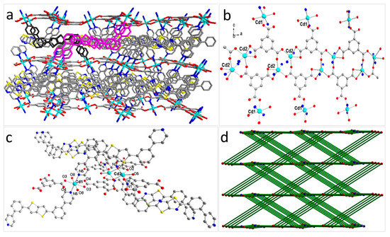 In the last twenty years, the design and synthesis of new coordination polymers (CPs) have become an important research area for their intriguing structures and interesting properties, such as catalysis [1,2,3,4,5,6], gas storage and separation [7,8,9], photoluminescence [10,11,12], biomedical uses [13], and other applications [14,15,16]. In order to make the CPs have special structures and properties, it is necessary to synthesize new ligands [17], in which the heteroaromatic thiazolothiazole unit can be employed as a building block incorporated into organic ligands; the strong π–π stacking and overlapping of the orbitals in thiazolothiazole unit can afford high electron and hole mobilities, which are crucial properties for efficient charge transfer in optoelectronic materials [18]; and the heteroaromatic thiazolothiazole unit has also shown high luminescence properties [19]. On the other hand, the luminescence properties of coordination polymers with d 10 metal centres Cd(II) have attracted intense interest because of the potential applications of these compolexes as luminescent sensing materials [20]. Therefore, the design and synthesis of diverse structural Cd–MOFs or Cd–CPs with optical properties are highly demanded [21,22].