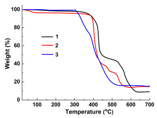 Thermal gravimetric analysis (TGA) curves of complexes 1–3.