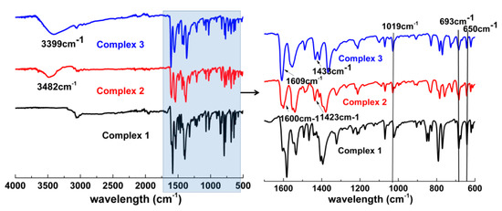 Comparison of FT-IR spectrum of complexes 1, 2, and 3.