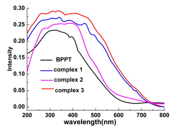 From the spectrum of UV/vis (Figure 6), the maximum absorption of BPPT, 1, 2, and 3 occurred at 330 nm, 340 nm, 330 nm, and 344 nm, respectively. The bands could be assigned to characteristic π–π* transitions centered on BPPT. Compared with the free ligand BPPT, the absorption peaks of 1, 2, and 3 have slightly red-shift, probably attributed to the coordination of the ligands to the Cd ion, which effectively increases the conjugated extent of the complexes [24].