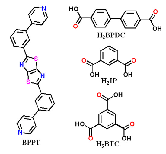 The structures of ligands used in the syntheses of the coordination polymers. BPPT, 2, 5-bis(3-(pyridine-4-yl)phenyl)thiazolo[5,4-d]thiazole; BPDC, (1,1′-biphenyl)-4,4′-dicarboxylic acid; IP, isophthalic acid; BTC, benzene-1,3,5-tricarboxylic acid.