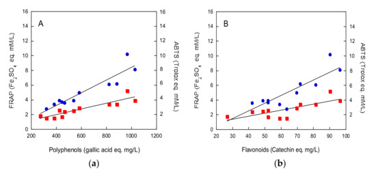 As shown in Figure 2a, a strong correlation between total polyphenols content, measured by Folin–Ciocalteu assay, and antioxidant activity of beers, measured by both the FRAP and ABTS assays, was found (r = 0.93815, p < 0.0001 for FRAP assay and r = 0.90592, p < 0.0001 for ABTS assay). Furthermore, a strict correlation was observed between the total flavonoids content and the antioxidant activity of beers, measured by both the FRAP and ABTS methods (r = 0.87913, p < 0.0002 for FRAP assay and r = 0.75286, p < 0.005 for ABTS assay) (Figure 2b).