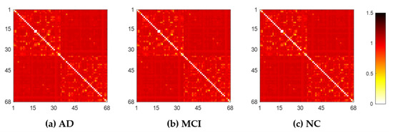 The original weighted white matter (WM) networks of the three groups, AD (a), MCI (b), and NC (c), where color bar shows the weights between any pair of region-of-interests (ROIs).