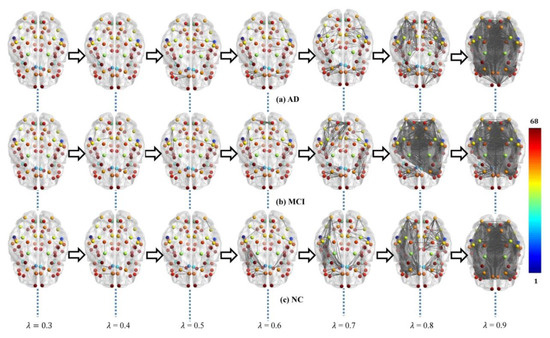 Multiscale WM networks of the three groups, AD (a), MCI (b), and NC (c), at some filtrations where color bar shows the ROI index. The AD group shows more sparse connections (i.e., more segregated connected components) comparing to controls when the filtration values are smaller (λ ≤ 0.8).