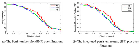 After constructing multiscale WM networks, we plotted two persistent features: Betti number β0 and IPF over all filtration values. Figure 3 shows the dynamic plots for the mean networks of AD, MCI, and NC groups. Consistent with Figure 2, there were more separately connected components in AD than MCI and NC at most filtration values, since the AD curve was above the MCI and NC curves most of the time, indicating a more segregated organization structure in AD.