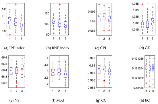 Box plots of network indices for 150 subjects across the three groups. Here, 1, 2, and 3 represent AD, MCI, and NC, respectively. Network indices: (a) IPF—integrated persistent feature; (b) BNP—Betti number plot; (c) CPL—characteristic path length; (d) GE—global efficiency; (e) NS—nodal strength; (f) Mod—modularity; (g) CC—clustering coefficient; and (h) EC—eigenvector centrality.