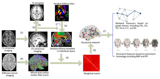 The structural brain network was defined through Desikan-Killiany brain atlas [31] with 68 ROIs. Each ROI was served as a network node. We constructed individual network for each subject using FSL software package following steps (1)–(6) in Figure 5.