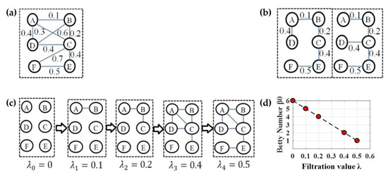Persistent homology [51,52] is a method for computing topological features of a space at different spatial resolutions in algebraic topology. More persistent features are detected over a wide range of length and are deemed more likely to represent true features of the underlying space, rather than artifacts of sampling, noise, or particular choice of parameters [53]. The Betti numbers are used to distinguish topological spaces based on the connectivity of k-dimensional simplicial complexes [18]. Specifically, the zeroth Betti number , i.e., the zeroth persistent homology refer to the number of connected components, and a connected component in the simplicial complex is a subset of nodes any two of which are connected. From the perspective of the graph decomposition into connected components, we may obtain many possible graph filtrations. In order to determine a maximal graph filtration for quantifying of a general graph, a common approach is single linkage dendrogram (SLD) [22,23,24,25] which is equivalent to constructing a minimum spanning tree (MST) [54]. Thus, we can obtain unique filtrations from the edge weight set of any MST because all possible MSTs of a graph have the identical weight set. As an example, we have two different MSTs in Figure 6b from the graph G in Figure 6a, and both have the identical weight set [0.1 0.2 0.4 0.4 0.5], thus the maximal graph filtration at five increasing filtration values 0, 0.1, 0.2, 0.4, and 0.5 is in Figure 6c where represents a subnetwork connected by edges with weights less than , and the numbers of connected components are 6, 5, 4, 2, and 1. Finally, the Betti number plot (BNP) over all possible filtration values (Figure 6d) is regarded as a persistent feature of original network in some studies [22,24,26].