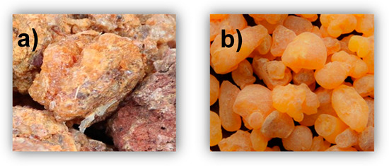 Frankincense, also known as Boswellia, is a dried sap or gum resin obtained from a tree belonging to the family Burseraceae. The tree is native to the Arabian Peninsula area, northeastern Africa, and India. The gum resin of frankincense has been used in folk medicine and in religious ceremonies as a fumigant since time immemorial in the ancient world (Figure 1). In terms of botanical data, the genus Boswellia has 21 species, but the most popular ones are Boswellia sacra, B. serrata, B. carterii, and B. papyrifera [1]. Details of more than 15 other Boswellia species are illustrated in a conclusive book on the biology of the genus Boswellia [2]. Presently, there is a growing interest in the different biological activities of frankincense gum resin [3,4,5,6]. Among these biological activities, the anti-inflammatory and anticancer properties of the gum resin have caught the attention of many researchers. These properties originate from two main fractions of frankincense gum resin, namely the volatile fraction (essential oil) and the nonvolatile fraction. The following section will shed more light on both fractions and how the chemical constitution of each fraction is involved in the overall anti-inflammatory and anticancer properties of frankincense.